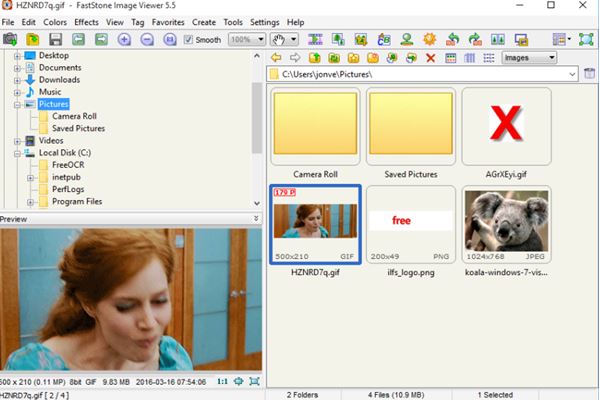 Left sidebar has a folder tree view up top and the preview area down below. Rest of the interface on the right is reserved for a file browser that you can use to browse through the directories and find the GIF files you want to view. Images have thumbnails for easier overview. Selecting an image opens it up in the preview section in the bottom left corner. Double click opens it fullscreen. Like with IrfanView, editing functionality is limited. Menu toolbar at the top has all the usual controls that do work like zooming in, zooming out, left/right switching between images in the directory, etc.