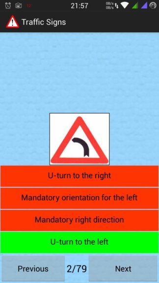 This app is a multiple choice type of app, where a road sign is showed and underneath it you will see 4 possible answers offered. When a wrong answer is given, the app will highlight it in red. Correct answers are highlighted in green.