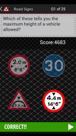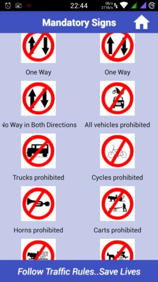 Large selection of mandatory, cautionary and informatory signs, road markings, driving rules, traffic signals and more is available. After you’ve familiarized yourself with everything, launch the quiz to test your knowledge.