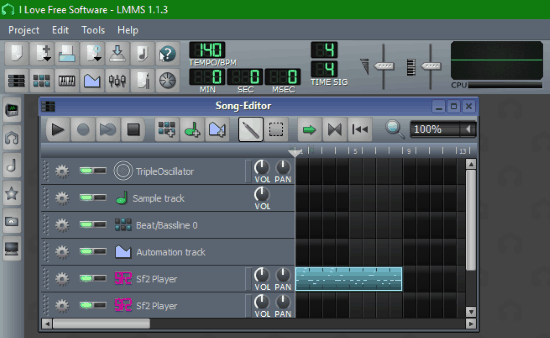 LMMS offers 4 different sound synthesizers: Guitar synthesizer, Wavetable synthesizer, Sample Manipulation synthesizer by adding filters, and the last one comes with three different oscillators for changing frequency and pitch of the sounds. It even supports various standards like VST, SoundFont2, LADSPA, and more which also make it compatible for importing FL Studio projects and MIDI files.