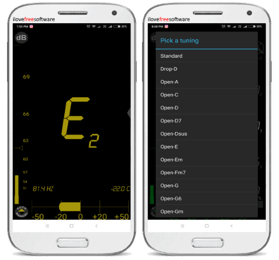 DaTuner Lite is also a free Android guitar tuner app which you can use to easily tune your (6-string and 12-string) guitar. For that, you would need to simply open the app and play the strings one by one. After that, it can detect the strings’ tuning and guide you to achieve the accurate tuning of the strings. It will tell you how low or high your strings are so that you can manually adjust them. You can tune your guitar for various tuning types including Open Dsus, Standard, Open G6, Open E, Drop D, and more.