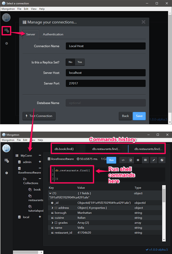 Mongotron is open-source and one of the best free MongoDB IDE for Windows. The IDE not only has a very intuitive interface but, it is a very good at handling MongoDB databases which are available locally or remotely. You simply start by connecting to your localhost (port=27017) for local database or you can enter the address of the remote database. After entering the details, it will show you all the databases and collections stored on the server. And after that, you can start using the software to view, edit, create databases and the corresponding collections. The software comes with a built-in shell that you can use to run the database commands. You can see the log of database operations in the MongoDB console.