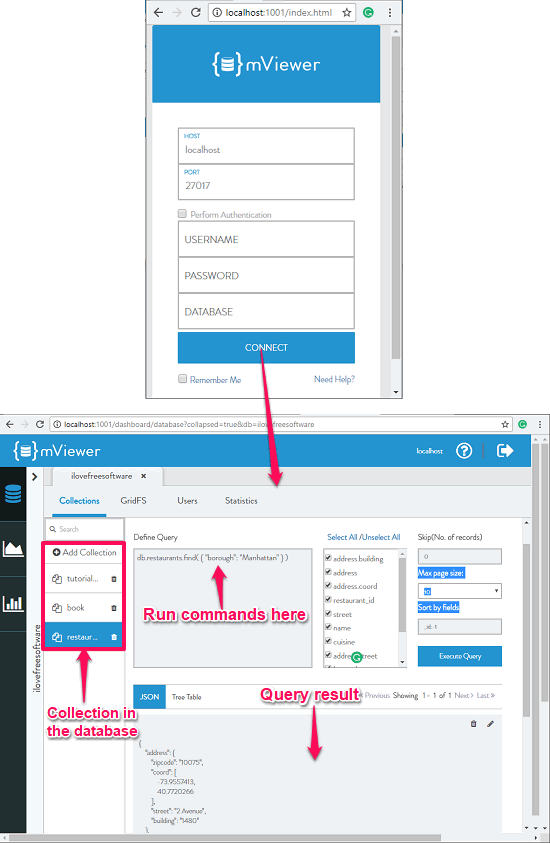 mViewer is quite a different MongoDB IDE for Windows that runs in the browser of your PC. And it requires Java available on your PC in order to run itself. It is also a very good IDE for MongoDB and lets you connect to a local or remote database server pretty easily. The software comes with a shell that you can use to run command to manipulate databases and collections. However, the shell of the software is very simple and doesn’t support auto complete or suggestions.