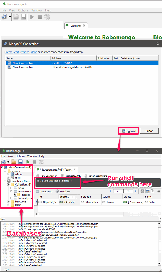 Robomongo is another open-source and free MongoDB IDE for Windows. It supports all the MongoDB features that you can hope for connecting to a MongoDB server, which is running locally or remotely. The software has a very good user interface and you can start it by simply adding the connection details of the MongoDB server you want to connect to. After connecting to your desired database, you will see the schemas and the collections right from its interface. A shell interpreter is included that you can use to run the database commands. All the database operations like find, update, create, insert can easily be done on any database. It makes a complete log of all the operations that you do.
