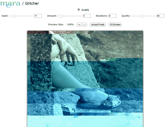 Mara Glitcher is another free image glitcher in this list. It is one of the many image editing tools provided by Mara. It provides various options to add images to apply glitch effect. You can add images from PC, paste image URL, add image from clipboard, add image from Dropbox, click photo from Webcam, or access Mara Stock Photos to choose one. After adding image, the above interface appears. From here, you can set values of Seed, Glitch Amount, Iterations, and Quality. When done, Save the image as JPEG, PNG, or WebP. You also get the option to set image quality before download.