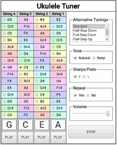 To do that, all you gotta do is click on the note buttons and then it will play the associated note sound. Now, you can try to match the sound on your ukulele by adjusting the tuning pegs. The notes are played automatically in a loop. You can listen to and tune each string individually.