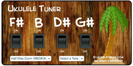 Ukulele Tuner (by Ukulele Tricks) can also be used to easily tune your ukulele. This ukulele tuner also lets you choose different types of preset tunings like Half-Step Up (g#C#FA#), Whole-Step Up (aDF#B), Low-G Tuning (GCEA), Slack-Key Tuning (gCEG), and more. You can simply open this website, choose any of the tunings, and then proceed to tune your ukulele. It also doesn’t show you a ukulele mockup and tuning pegs.
