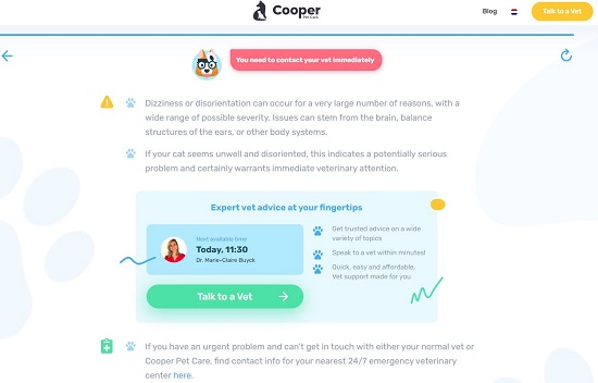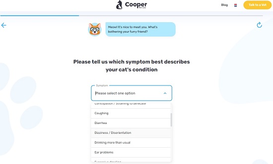 Simply choose if you have a Cat or Dog as a pet, specify the symptoms that best describe the pet’s condition and answer a few important questions based on the symptoms that you have specified. At the end, Cooper Pet Care will provide information about the condition, what the symptoms may signify, and what are the next possible steps that you must follow. You can also schedule an online appointment with a Vet if required.