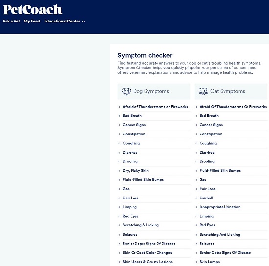 Pet Coach offers a list of approximately 25 symptoms that your pet may be experiencing. If your pet’s symptoms aren’t on the list, then this website will not be of much help to you. In that case you probably need to use some other tools that we have listed in this article.