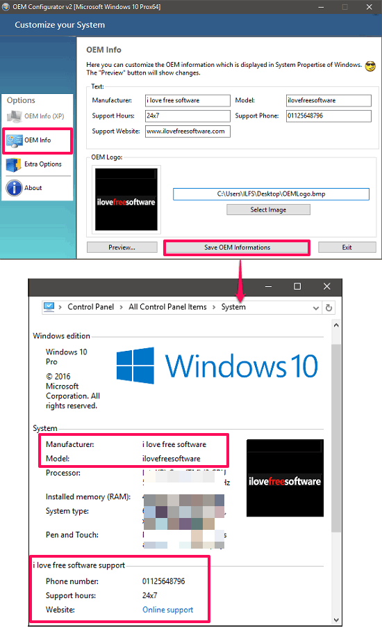 So, in this way you can easily modify OEM information of any PC using OEM Configurator. I really like this software as it has also included a feature to modify system information such as processor name and owner name. So, if you want to completely modify the System properties, then OEM Configurator is a very good option.