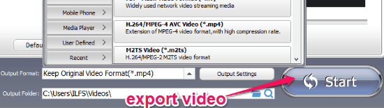 Step 3: When you’re done selecting an area on the video, you can go ahead and export the video to your PC. For this, click on the “Output Format” option and then choose any of the supported video formats (like MP4, DIVX, AVI, FLV, etc.) for exporting the cropped video. After that, choose the destination folder and hit the “Start” button.