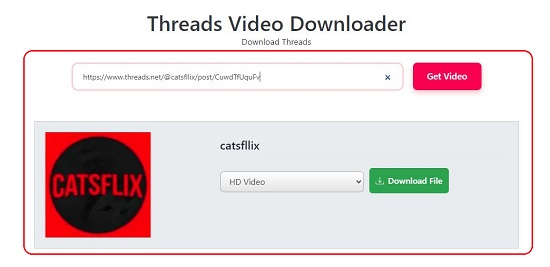 Paste the URL of the Threads Video and click on the ‘Get Video’ button. Wait for a few seconds for the website to fetch the video from Threads and then click on the ‘Download File’ button to save the video in your computer in MP4 format.