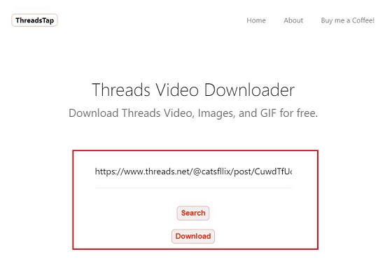 Let us now move to the next free online tool to download videos from Threads App namely, ThreadsTap. Like the previous tool, simply click on the link that below, paste the Threads video URL and click on ‘Search’.