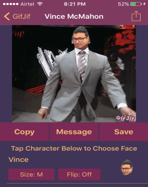 Step 4: When you’re done with selecting a GIF, tap it and proceed to the editor. To insert your own face to the GIF, tap the option “Tap Character Below to Choose Face” at the bottom of the editor. The editor also has the options to copy a GIF, directly message a GIF, save it, change the face size, and flip faces as shown below.