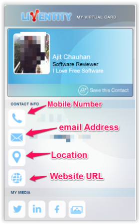 The last business card maker app for iPhone in this list is Liventity. The Liventity app lets you fill the details manually or importing details from Facebook/LinkedIn profile. The app also lets you add your skills and expertise as Keywords for better searching when you are messing up with a large number of cards within the app. The card created by the app can be shared via Facebook, Twitter, AirShare (App’s own feature), email, SMS, and QR Code.