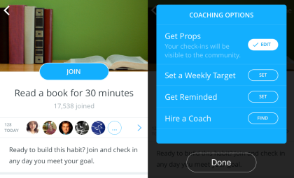 Tap on the goal type you want to join and you will see the interface shown in the screenshot below. Tap on Join to join the goal. While joining any goal, you have to set a few coaching options like get props (record of check-ins), weekly target, reminder, and hire a coach.