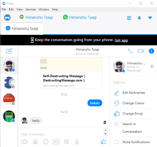 Franz is a multi-chat IM software that supports Facebook messenger. Apart from Facebook messenger, it supports Hangouts, Whatsapp, Slack, Telegram, LinkedIn, Facebook page, Yahoo messenger, and many other. So, Franz proves to be a great desktop client that can help you in communicating with people on different social platforms from a single place. Franz is available for Windows, Linux, and Mac. You can use Facebook messenger service of Franz to send stickers, gif, images, and text messages to a person or a Facebook group. Apart from these basic options, you will also be able to mute/receive desktop notifications for a particular person or group conversation and see the list of active friends on Facebook.
