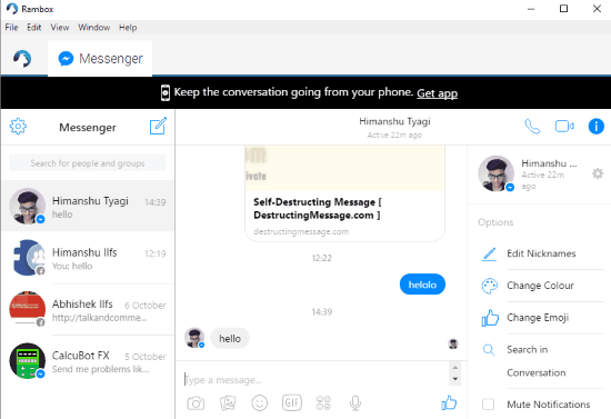 Rambox also lets you add multiple accounts for a web service. It keeps all added accounts in different tabs. So, you can switch between these tabs and communicate on all web services from the Rambox interface side by side. Talking about Facebook Messenger service of Rambox, it’s very similar to official Facebook Messenger web application. You can send stickers, images, gif, etc to a single FB user or a Facebook group. You can also make audio and video calls to your Facebook contacts. It also notifies you about newer FB messages through sound desktop notifications.