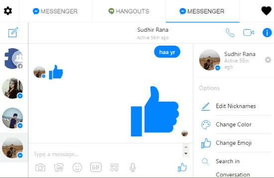 All-in-one Messenger is a multi-chat IM Chrome application that supports Facebook messenger. It supports Facebook Messenger, WhatsApp, Skype, Slack, etc. This Chrome app also works in same manner as Rambox and Franz, but its added advantage is that is is quite lightweight. If I throw some light on its Facebook messaging service then it’s interface is quite to similar to FB Messenger web application. You can send text messages, stickers, gif, images, emoticons, etc to an FB user or group conversation. It also lets you make audio and video calls to your Facebook contacts.