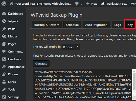 Step 3: Now, you need to generate a key on the destination site. On the destination blank WordPress site, open the WPvivid Backup Plugin and then go to the “Key” tab. Click “Generate” button and it will generate a self destructing key that you have to copy.