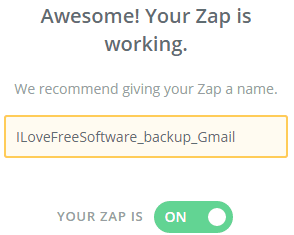 After that, click on the Continue button and then Create & Continue button to finish up the process. Now, it will show your created Zap to automatically backup Gmail emails to Dropbox. You will need to turn this “On”.