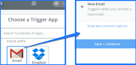 Step 2: Now, Zapier will open up its wizard to create the Zap. Select Gmail as the Trigger App and then select “New Email”, as shown in the screenshot below. Click on the “Save + Continue” button to move to the next step.
