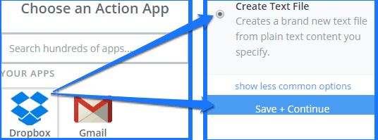 Step 4: Now, select Dropbox as the Action app and select “Create Text File” as the action to be performed when a new Gmail email is received.