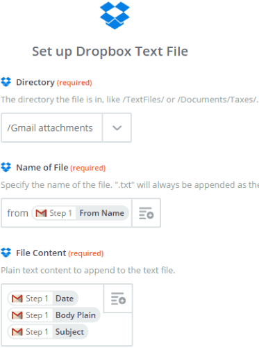 Step 5: In this step, you have to setup the template for the Text File. You can start by first specifying the Dropbox folder where you want to save the Gmail emails text files. After that specify the TXT file naming convention, by selecting the variables/ingredients from the drop-down list. After that, choose the content that you want to view in a Gmail email TXT file from the File Content drop-down list. It is better to place variables in separate lines as you can see in the screenshot below.