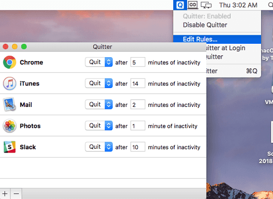 Quitter is a simple and powerful MAC app that you can use to automatically close applications. And it does that very intelligently. You just have to create some rules in it and then let it handle the rest. If it sees an app is inactive for specified minutes then it will quit it. Simple as that. And you can anytime edit the list of rules right from its menu bar icon.