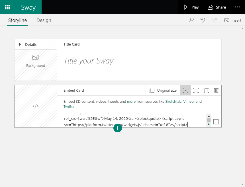 The embed card is where you can paste the embed code to add the respective content to the sway. After pasting the embed code, you can also pick a size for the content. It gives you three different options for that. Once done, simply click away from the embed card to save the changes.