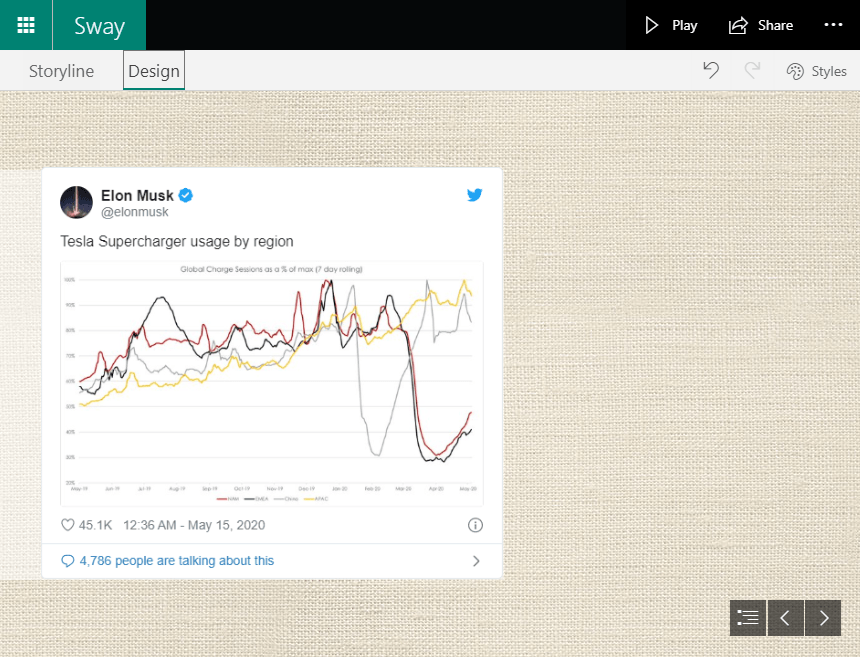 In the Storyline section, you see a thumbnail of the embedded content. The actual preview appears in the Design section. You can instantly switch between these sections anytime and be sure of how the content is going to look. Since sway creates interactive projects, the embed content is clickable leading to the source, if any.