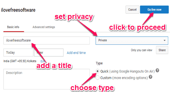 Step 4: Now, it will ask you to enter few details for the new event like a title, description, set privacy, tags, etc. Here, all you need to do is simply give a name to the event, set the privacy as “Private”, and choose the type as “Quick (using Google Hangouts on Air)”. Once you’re done, simply click on the “Go Live Now” button at the top to continue.