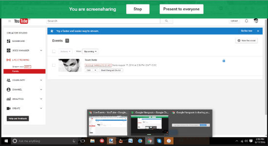 Step 7: Once the screen sharing starts, you need to hit the “Start Broadcast” button at the bottom of the “Google Hangouts on Air” window. As soon as you do that, the screen recording will start and the maximum length of the video which you can record will be up to 8 hours. Let’s say, you’ve selected “Entire Screen” in the above step, then whatever activities you would do on your entire PC will be recorded automatically.