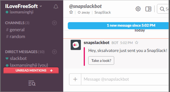 Step 4: When you send the self-destructing message, the recipient will receive a notification by “snapslackbot” that you have sent him a message along with a button “Take a Look?” using which the recipient will be able to read your message.