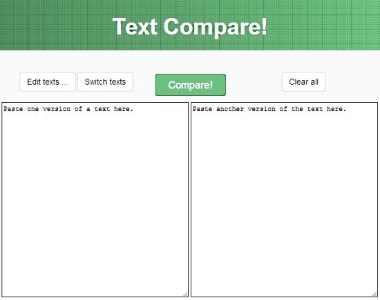 This is the easiest online text comparison website that I have come across. Just go to the website, paste your texts, and you are done. The entire process takes just a few moments. It does lacks any advanced features, but more than makes up for that with its simplicity.