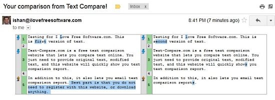 Text-Compare.com is a free text comparison website that lets you compare text online. You just need to provide original text, modified text, and this website will quickly show you text comparison report. In addition to this, it also lets you email text comparison report. Best part is that you do not need to register with this website, or download anything.