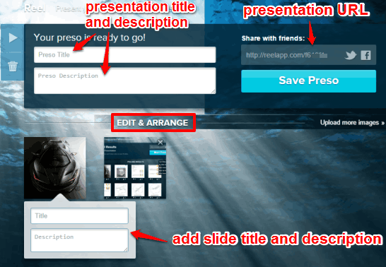 Once the files are uploaded, it will process them to generate the presentation. A unique link of your presentation is generated. You can give it to others. Before doing that, it would be good to add name and description for your presentation. Moreover, you can also add title and description for each individual slide.