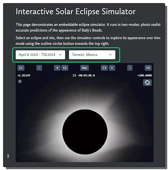 This simulator takes account of the variable profile of the lunar limb to provide accurate predictions of the appearance of Baily’s Beads. You can select a solar eclipse and pick a site to explore its appearance over time. You can pinch to zoom or drag to pan the simulator view. At the bottom, you get simulation playback controls where you can adjust the speed of the simulation, loop it, and play it back. With all that, you can simulate the upcoming solar eclipses.