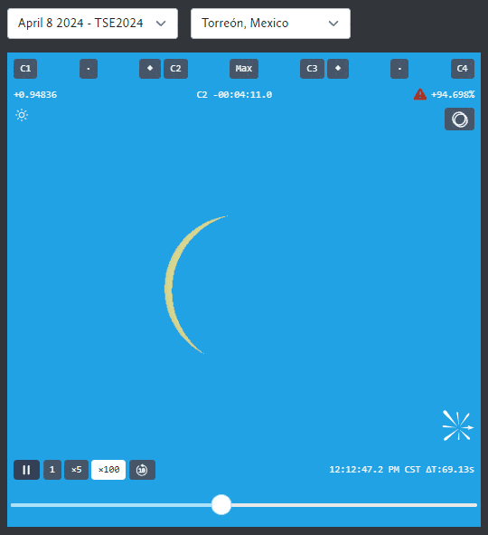 The simulation shows various information along with some buttons. You can use those simulator controls to explore eclipse appearance over time. At the top, you get buttons to jump to different phases of the eclipse. On the left, it has a sparkle-like button that shows the Parallectic Angle, Position Angle, and Explementory Value of Position. On the right, it has a mode button to switch between photo-realistic and outline modes.