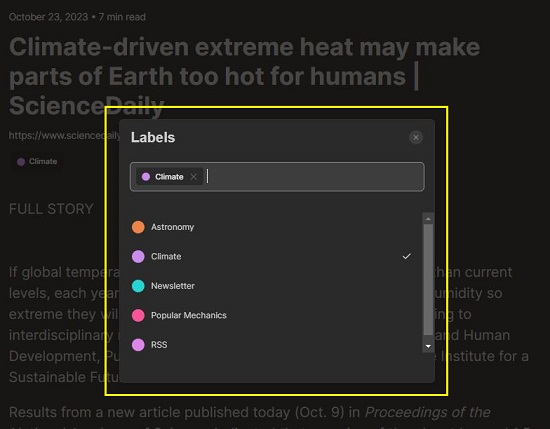 6. You can click on ‘Add note’ in the Omnivore mini-toolbar at the top right of the page to add any notes to the article if required. Additionally, you can click on ‘Set Labels’ and choose an existing label to tag the article. You can also add a new label by typing its name and pressing ‘Enter’.