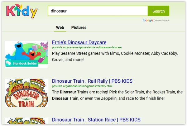 The results are shown under two tabs, web and pictures. In the web section all the website links can be seen related to your search query. All the website which show up are kid friendly and do not have any malicious content. Mostly websites to show up are kids websites like PBS Kids, National Geographic Kids, etc. The pictures section also has nice pictures and no violent stuff.