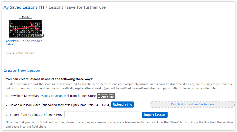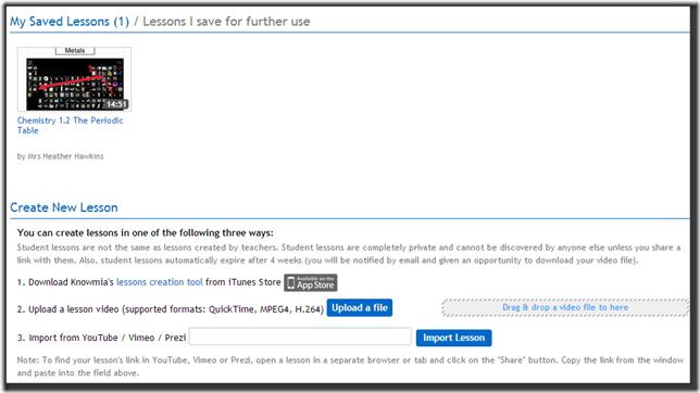 The website offers some other options for the registered students. If you are a registered user, then you will see a option called myKnowmia at the top right corner. Click on it to access the options which are exclusive for registered user. They can also create their own lessons by either uploading or importing the video file. The importing of videos are permitted from YouTube, Vimeo, and Prezi. The registered users can check the assignments, lessons uploaded by them, favorite lessons, and saved lessons.
