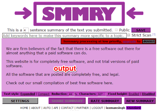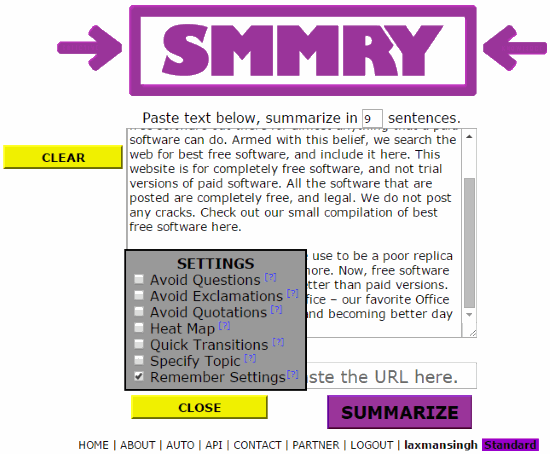SMMRY is a free online summary generator to automatically summarize any text. Whether you want to summarize a paragraph, article, essay, or any other text, this summary generator is handy. There are other summary generators which also exist, but the way it summarizes the text is pretty impressive. You can enable a couple of options that help to generate summary as meaningful as possible. For example, you can enable options to avoid sentences that contain questions, exclamations, quotation marks, and more.