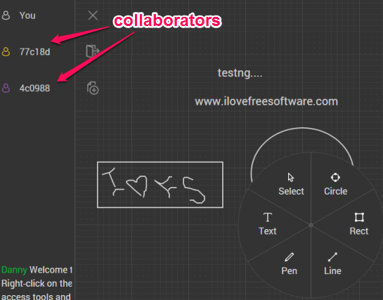 It provides multiple, but basic tools, such as: text tool, rectangle, circle, line, select tool, and pen tool (for freehand writing). You can use these tools to work on an idea and discuss important points with your colleagues/friends.