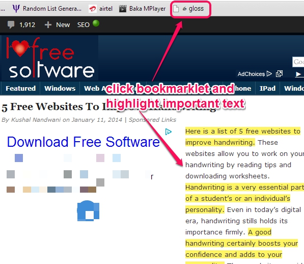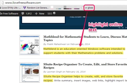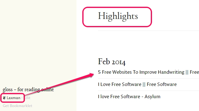 glossed.it (or Gloss) is an online text highlighter service that helps to save important text and read saved highlights later on. You need to create a free account so that you can highlight any online quote and can access saved quotes from your Gloss account. Whenever you find a useful text/quote that you want to keep with you, Gloss is helpful in that case. It will let you use a Bookmarklet that will be available on bookmark toolbar of your browser to highlight multiple text.