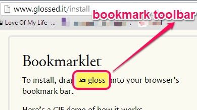 After creating your account, you need to install Gloss bookmarklet on your web browser. For this, use Get Bookmarklet option. It will provide you a gloss icon, like visible in screenshot below. Drag this gloss icon and drop it to bookmark toolbar. If you haven’t enabled bookmark toolbar, then first enable it to make it visible on your web browser.
