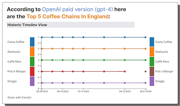 The first result is from OpenAI free version (gpt-3.5-turbo). It shows the Latest Top List. It plots the listing on a graph with color coding. It shows the data from a particular date only. Next to that, it has a button to copy the link to share the results with others.