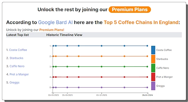To search for a product, you have to follow a specific format. You have to write your search query starting with “Top 5”, “Top 3”, “Best 5” or something similar. It is recommended to use the product category instead of the name for better results. For example, if you want to track a coffee chain in England, you can use “Top 5 Coffee Chains in England” as your search query. The results get you the top 5 recommendations from popular AI models.