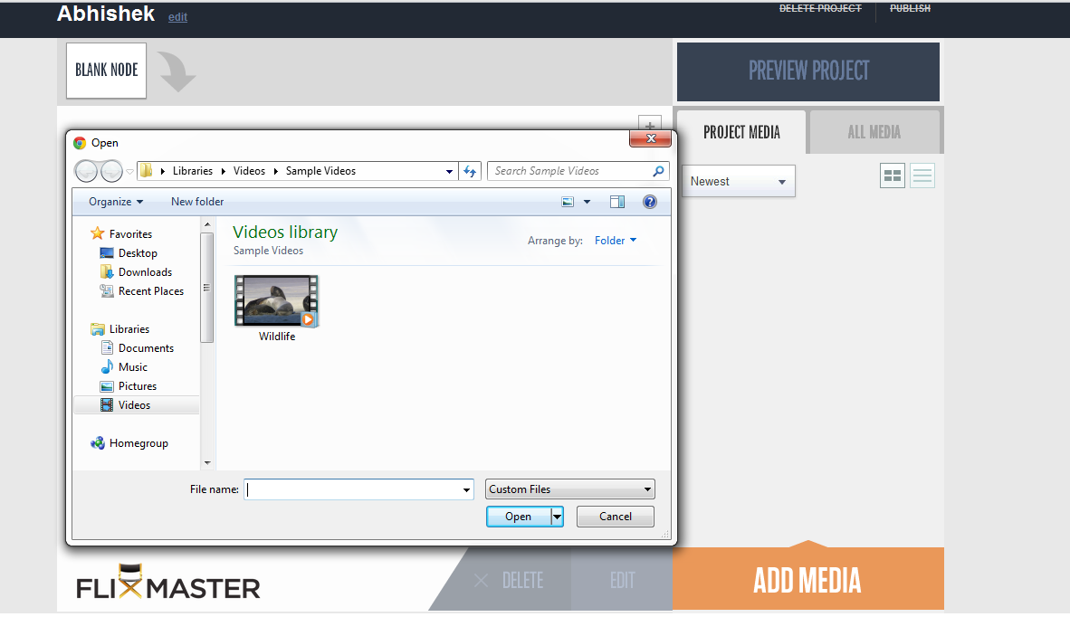 To upload the videos you need to click on “Add Media,” then you will be given an option to select the desired video from your computer. You can either choose to trim the current video or upload different videos to merge them together. After you finish with the project you can click on preview project and have a look at the project before publishing them. At the top right corner you can find the option to either delete the project or publish it. Once you click on publish the created video will be published. Before you publish the project always enter a node as the app does not publish blank node projects.