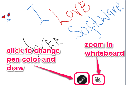 After this, all of you can draw together, and changes will be visible in real-time. At bottom of the board, you will find Pen tool. Clicking on this tool will help you change color (red, blue, and black) and draw on the whiteboard.